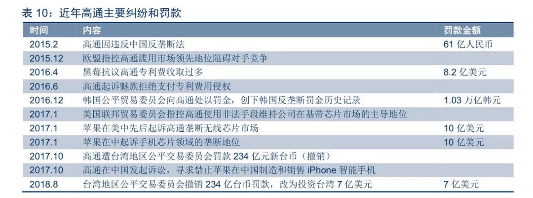 高通以整机成本为基础的收费模式正在受到越来越多的挑战。从2009年到2018年期间,高通在全球范围内因垄断或妨碍公平竞争等问题,受到行政罚单总额达40多亿美元。这影响了高通的营收,也给其业务模式和盈利能力埋下不确定性。