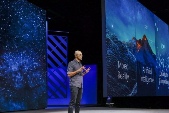 纳德拉在现场讲述未来科技的三大动力(图片来源:微软)
