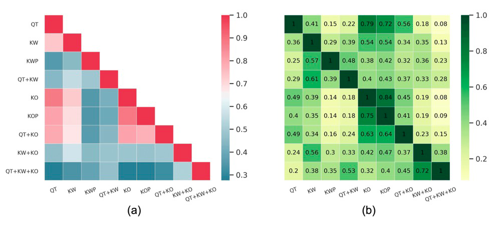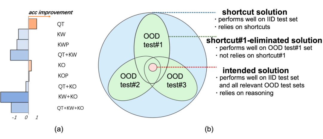 ▲ 图5(a)训练集所有头部划分之间的 Jaccard 相似系数。该值越高,两种捷径越相关。(b)所有 OOD 测试集两两之间的重合率。坐标(KO,QT)的方块表示 QT OOD 测试集中 KO 和 QT 重复样本所占的比例