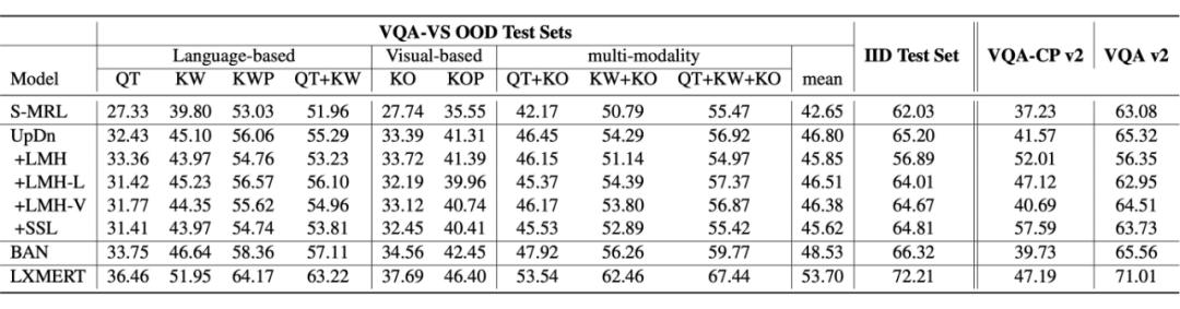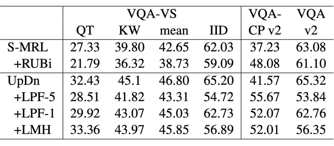 在 VQA-CP 上的 SOTA debiasing 方法(如 RuBi,LPF,LMH)倾向于阻止模型学习训练集中的频繁样本。如表3左侧所示,这些模型在我们的 IID 和 OOD 测试集(甚至在 QT 捷径上)均出现显著下降。