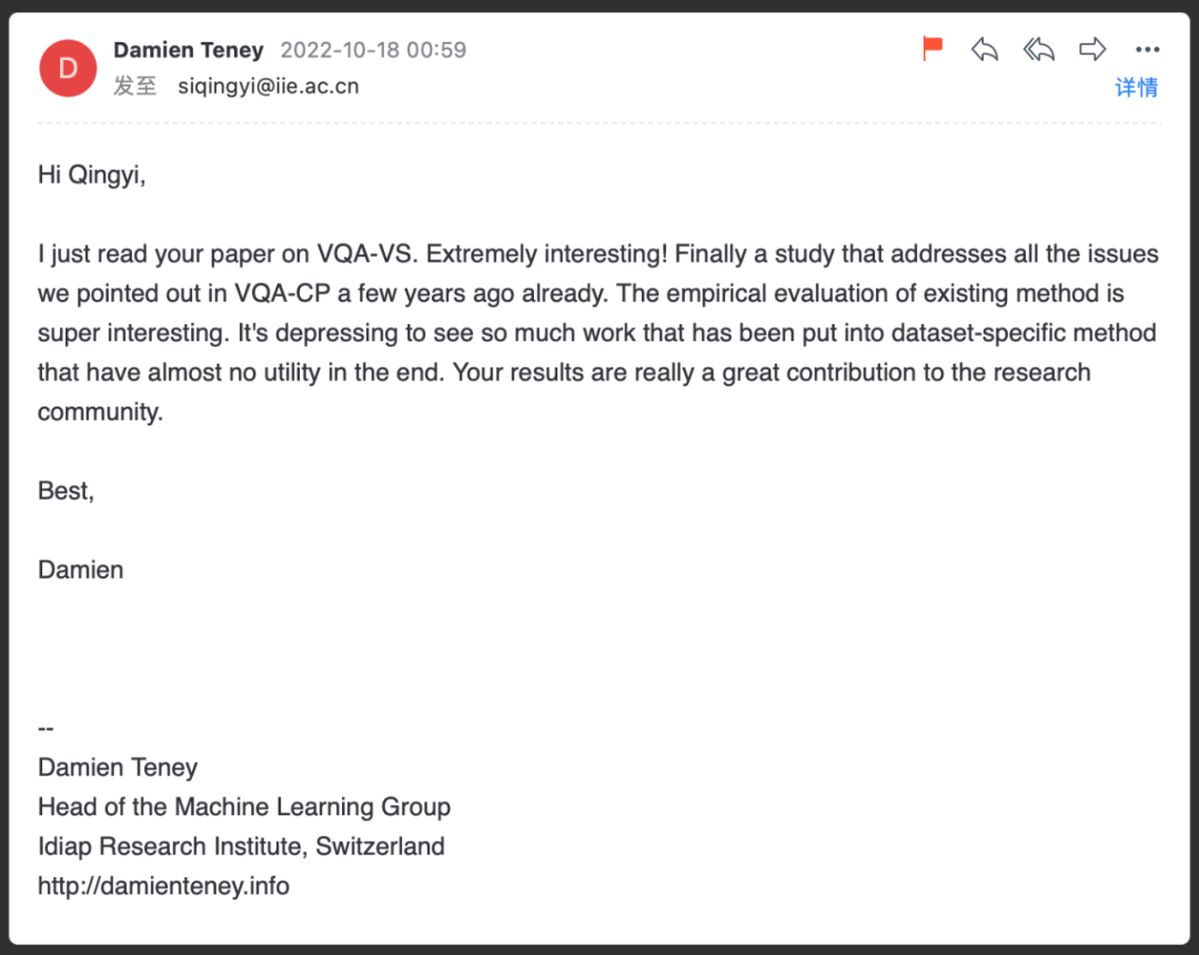 该论文放在 arxiv 后一周左右,笔者收到了 Damien Teney 的来信,如图 6 所示,Damien Teney 肯定了我们的贡献,并认为我们很好地解决了他在 [6] 中指出的这些问题。同时,如图 7 所示,他在 Twitter 上对我们的工作进行了转发,并对这个社区范围内的自适应过拟合现象(community-wide adaptive overfitting)为研究者们总结了几点建议。