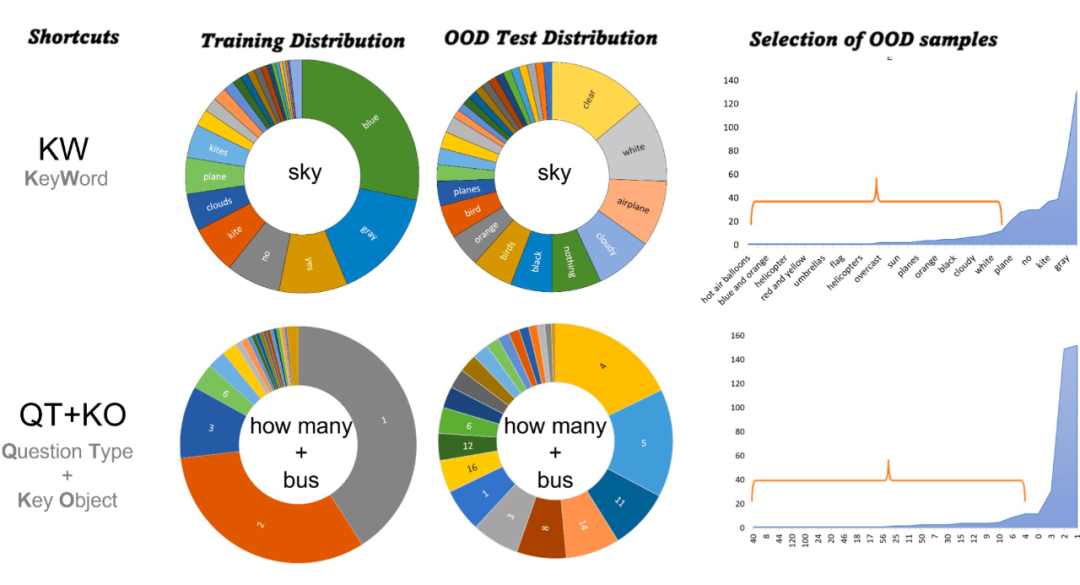 关于基于语言模态的 QT 捷径,答案 “black” 在训练集中总能正确回答问题词为 “what color” 的问题;关于 KW 捷径,关键词 “grass” 和答案 “green” 总是高频共现;