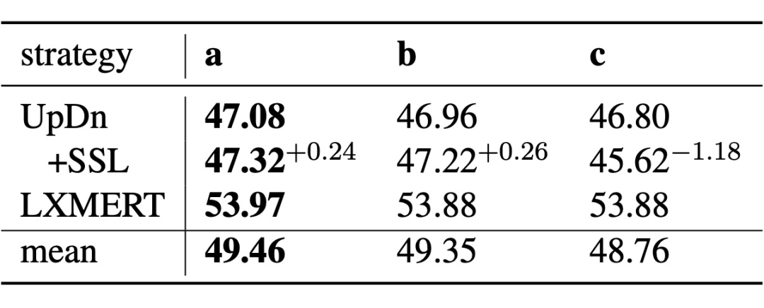 ▲ 表4 采用三种模型 checkpoint 选择策略的结果。a/b/c 分别表示使用 OOD 测试集 /OOD 验证集/IID验证集对 checkpoint 进行选择