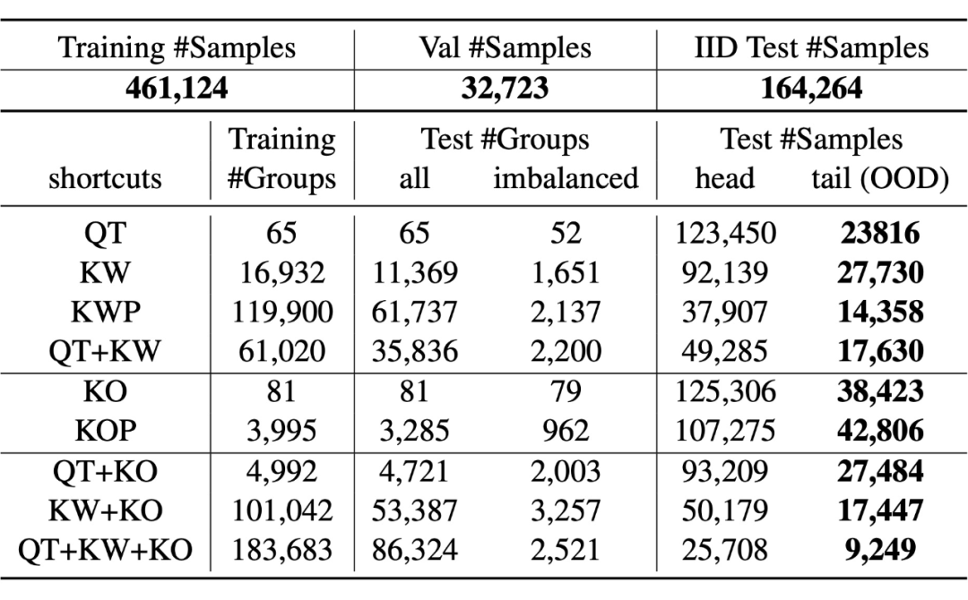 表 1 表示了 VQA-VS 的数据统计,以及每个捷径的分组和样本统计。不同捷径的组总数差异显著(65~183683)。