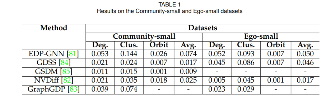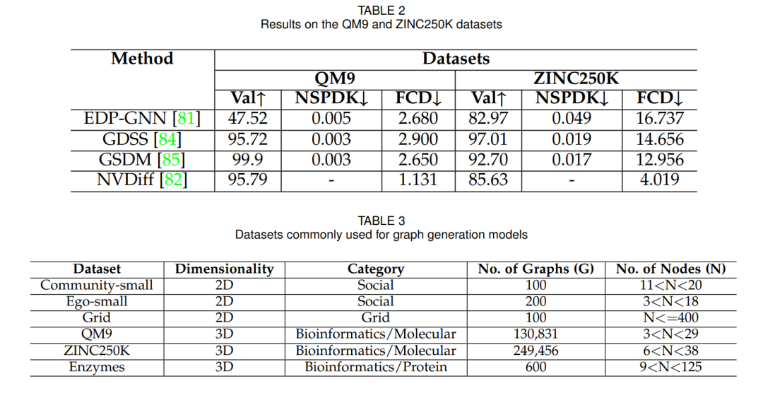 Mischaneous。早期的图扩散工作扩散邻接矩阵用于边扩散,EDP-GNN[81],专注于无向图的生成,只在邻接矩阵的上三角部分添加了噪声。然后,为了使生成的图在采样时离散化,对采样后的连续邻接矩阵进行阈值化;尽管仅扩散图的一个结构元素的方法显示了很好的结果,但它们没有完全捕获节点和边之间的关系,这对生成现实世界的图(如分子)很重要。为了克服这个问题,GDSS[84]通过两个sde同时扩散。它并行地对节点和边之间的复杂依赖关系进行建模。由于节点和边在排列方面的行为不同,需要不同的建模,因此GDSS使用图注意力网络进行去噪过程。然而,独立学习节点和边表示的模型忽略了它们之间的相互依赖关系[82]。为了解决这些问题,NVDiff[82]仅扩散通过GraphVAE[61]编码的节点向量的潜在表示,捕捉图的结构信息,并使用基于注意力的分数生成模型(SGM)作为先验来捕获图中的局部和全局上下文。
