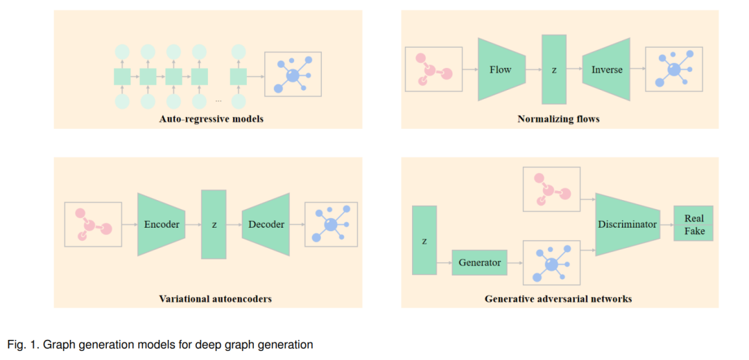 生成模型,如Erdos-Renyi[37]、WattsStrogatz[38]、barabsi - albert[39]和R-MAT[40],会手动观察实际图的特定重要属性,并据此构建算法。虽然这些模型可能成功地捕获了实际图的一些特征,但它们缺乏灵活性来建模不同的图属性[4],[16],[41],[41]。此外,生成模型可能难以生成表明观察到的连接模式或[42]行为的图。因此,需要开发更复杂的生成模型,以集成更全面的图属性范围,并产生更真实的结果[43]。在本节中,我们根据算法分类简要回顾了深度图生成模型。无论数据类型如何,有四种流行的生成式建模方法,分别是自回归模型[44]、变分自编码器[45]、归一化流[46]和生成式对抗网络[47]。在这里,我们总结了深度图生成模型的统一框架,如图1所示。