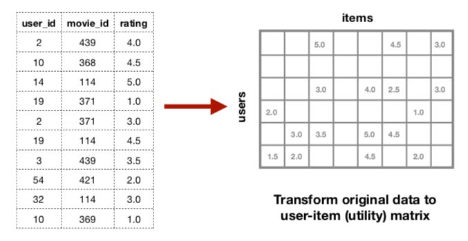 我们要先将电影评分数据帧转换为用户-物品矩阵,也称为效用矩阵(utility matrix)。
