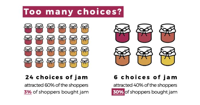 这项实验的目的是判断哪种情况能获得更高的销量,预想的是更多种类的果酱能吸引更多的人,从而带来更多的生意。然而,研究人员观察到一种奇怪的现象:尽管摆上 24 种果酱时摊位吸引了更多人的兴趣,但与只呈上 6 种果酱时相比,销售额反而更低(大约是后者的十分之一)。