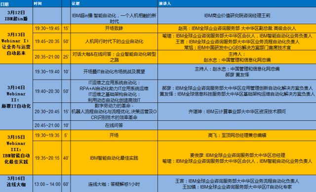 •3月15日19:30-20:15, IBM智能自动化最佳实践,为您揭秘企业智能自动化的最新探索和实践