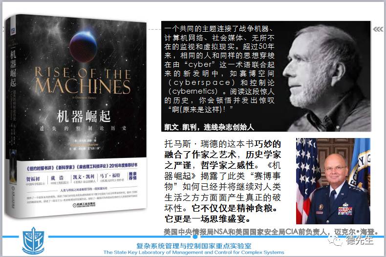 《机器崛起》一书现在在国内的出版,正值中国人工智能崛起的冲锋号吹响之际,让广大读者学习了解维纳和cybernetics在近代科技发展中的卓越贡献具有重要的现实意义。大家知道,习近平总书记在2016年中国“科技三会”上号召:“希望广大科技工作者以提高全民科学素质为己任,把普及科学知识、弘扬科学精神、传播科学思想、倡导科学方法作为义不容辞的责任,在全社会推动形成讲科学、爱科学、学科学、用科学的良好氛围,使蕴藏在亿万人民中间的创新智慧充分释放,创新力量充分涌流。”科学普及包括科学知识、科学思想与科学方法的普及,而了解科学史则是综合学习科学知识、科学思想和方法很好的途径。《机器崛起》是一本cybernetics科学史的传播巨著,它描述了20世纪中叶产生的“赛博科学”的发生和发展历程,生动记述了许多鲜为人知的故事与事件,揭示了赛博科学思想发展与人类文明进步的关联,以及社会支撑系统、军事装备技术和机器的关系,总结了赛博科技创新过程中的实例,探索了赛博科技发展的规律,特别是最后两章预测了赛博社会、赛博空间、赛博战争的未来,由cybernetics理念引出对21世纪赛博空间的赛博战争中传统机器陨落的担忧,鼓励人们用赛博科学思想迎接面向赛博空间“物理域的明战、信息域的暗战、社会域的观战、赛博域的混合战”之挑战,从而帮助我们在迈向智能时代的征程中,正确把握科技发展方向,用赛博思想去推动人类文明的进步和军事技术的创新,实现人机共融。