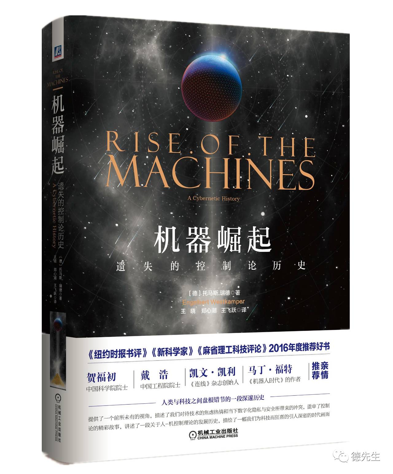 《机器崛起(Rise of the Machines)》一书是《麻省理工技术评论》、《君子》、《财富》杂志评定的2016年最佳书籍之一。书中,作者分三个阶段讲述了控制论的发展历程:最先用人类的思维去改造机器,即研究拟人化的机器,在体能和智能上要超越人类;接着用机械化理论控制、改造并重塑人类,认为思维也是一种机器,有规律可循,可按照改造机器人的方式改造人类身体;最后用机器改造环境,可构建美好的梦幻空间、虚拟世界、虚拟现实,无法律约束,无政府管制。2016年,本书一经出版,便得到了众多国际主流学者及媒体的高度评价。