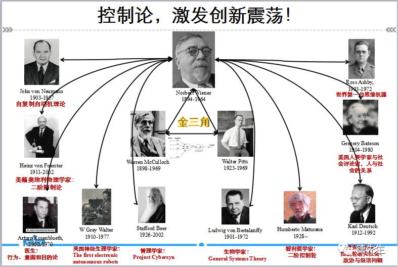 实际上,维纳的最大贡献可能是将机电伺服系统的物理反馈现象推广为生理神经上的“目标性行为”(purposeful behaviors)和哲学上的“循环因果律”(circular causality)及“循环逻辑”(circular logic),认为人类、生物和智能机器等都是通过“由负反馈和循环因果律逻辑来控制的目标性行为(purposeful action governed by negative feedback and the logic of circular causality)”实现其目的[7]。这与当时在科学中居统治地位的因果范式冲突,但形成了控制论的思想基础。正在这一基础之上,再加上1943年麦卡洛特和波特关于神经系统固有思维逻辑运算的革命性文章[8],才有了后来的“控制论小组”和梅西系列会议,最后正式诞生了控制论这一领域。