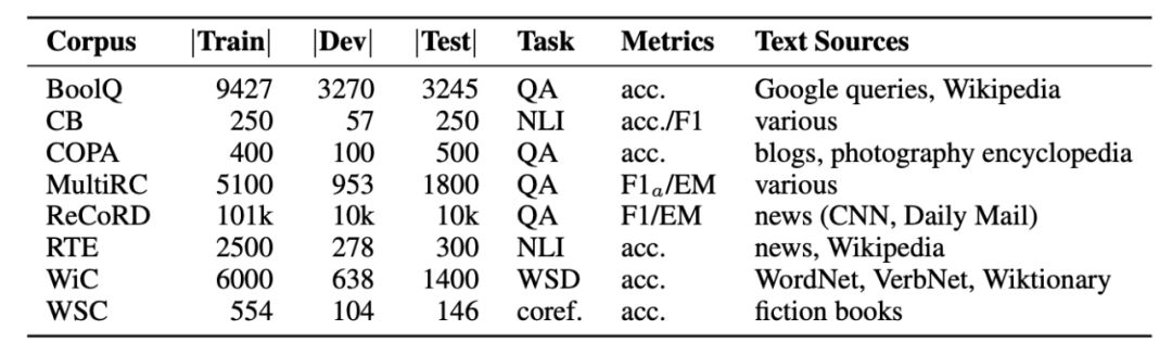 因为BERT在GLUE上是当前最成功的方法,所以SuperGLUE也使用BERT-LARGE-CASED variant.11作为模型性能基准。