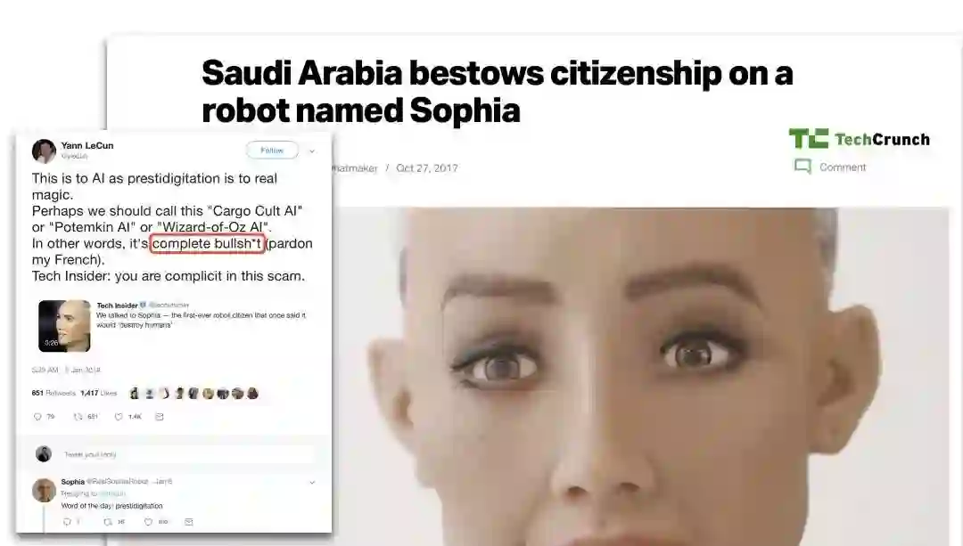 简单来说,Sophia是一个带喇叭的木偶——在各种大会上的发言和采访的内容都是人工撰写,然后用人人都有的语音合成做输出。却被宣传成为是其“人工智能”的自主意识言论。