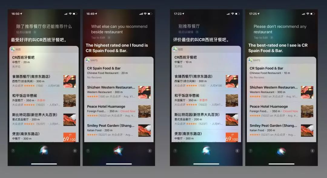 我在2016年底做过一个测试,对几个智能助理提一个看似简单的需求:“推荐餐厅,不要日本菜”。只是各家的AI助理都会给出一堆餐厅推荐,全是日本菜。