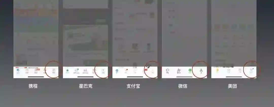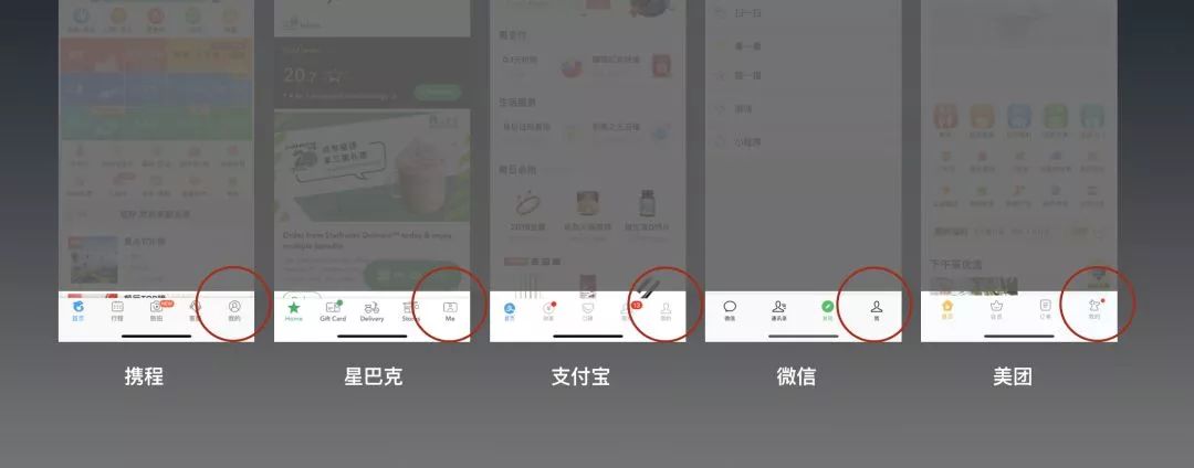 APP发展到后面,随着用户的使用习惯的形成,和业界内成功案例的“互相交流”,逐步形成了一些设计上的共识,比如下面这一排,最右边红圈里的 “我”: