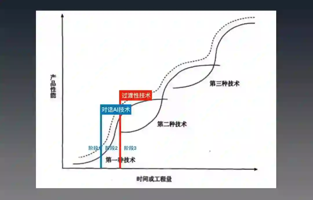 而当前对话AI的技术,还在第一阶段(蓝色旗帜位置)称不上是高速发展,还处于探索的早期。黑箱的情况,会使得这个周期(第一阶段)可能比移动时代更长。