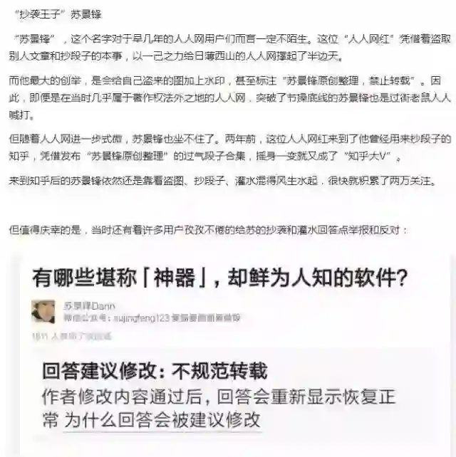 A站知乎号的运营者是曾经的抄袭王子,名叫苏景锋,一个曾经的人人网网红。这位网红靠着“搬运”段子发家致富,还在继续着将盗来的东西写为原创。