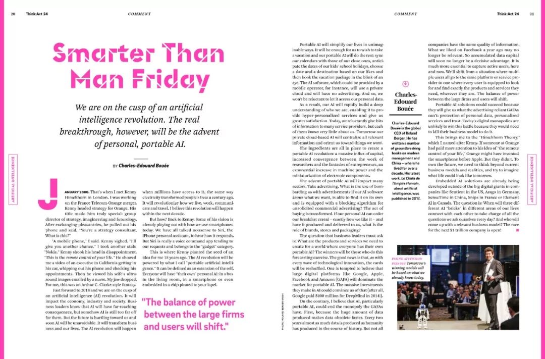 便携式人工智能将以难以想象的方式简化我们的生活。对于我们来说,休假就足够了,便携式人工智能将完成剩下的工作,同步日程、预计学校假期,并根据我们的日期选择目的地及预订度假套餐等。人工智能将迅速建立对我们的身份的深刻理解,使其能够转化为超级个性化的服务,并给予我们更大的满意。
