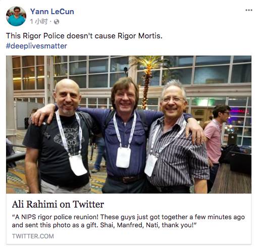 这事还没完,阿里随后晒出了自己在NIPS现场的合影,并称“A NIPS rigor police reuinion”(NIPS 严谨警察聚在一起),LeCun随后转发并评论:Rigor 警察没引起 Rigor Mortis(死后的第三阶段,也就是尸体变硬)。