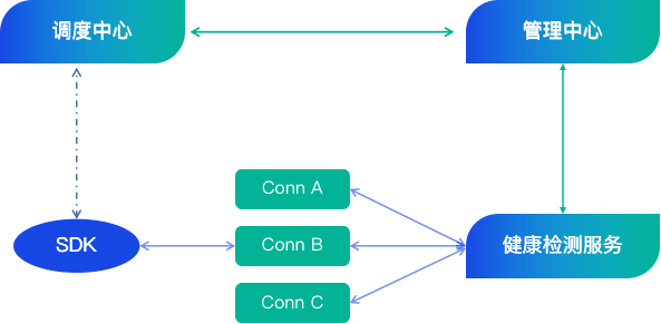 首先 SDK 向极光调度中心发起请求,调度中心充分考虑运营商网络、SDK 的地域和接入网关本身的负载因素,分配一个接入网关的 IP 地址,SDK 获得返回接入网关地址后,向对应的接入网关发起请求建立长链接。此外极光配有健康检测服务模块,定时检测各个接入网关状态并上报到管理中心,管理中心会根据网关的状态来决定该网关是否是可以被调度。如果受到攻击等因素导致接入网关大范围不可用的情况下,接入网关还可以借助于云主机来实现自动扩容接入网关,以满足日常大量的 SDK 接入需求。