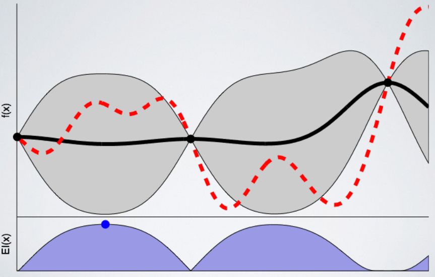 在此示例中,我们使用了 Expected Improvement:这个函数旨在在我们使用不确定性区域中的建议配置时找到尽可能低的值。上面的 Expected Improvement 图表中的蓝点即为下一次训练选择的点。
