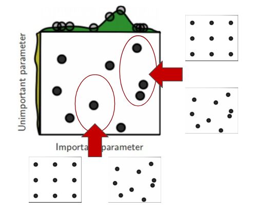 图像通过在两个超参数空间上搜索最佳配置来比较两种方法。它还假设一个参数比另一个参数更重要。这是一个安全的假设,因为开头提到的深度学习模型确实充满了超参数,并且研究员/科学家/学生一般都知道哪些超参数对训练影响最大。