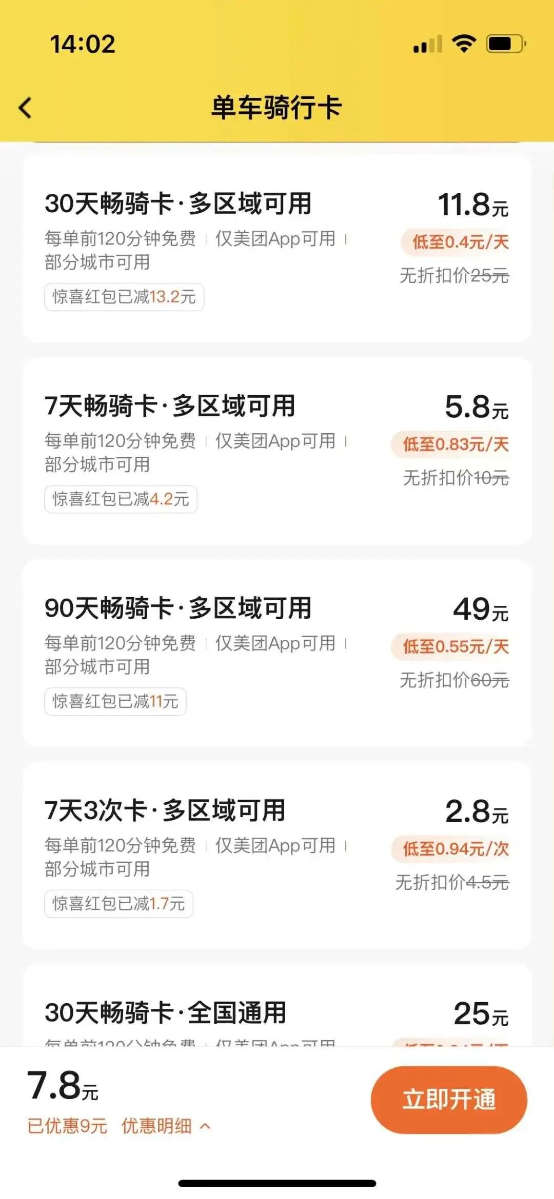 不过美团单车经常会有优惠活动,除全国通用卡外,其他可能会有6折左右优惠。