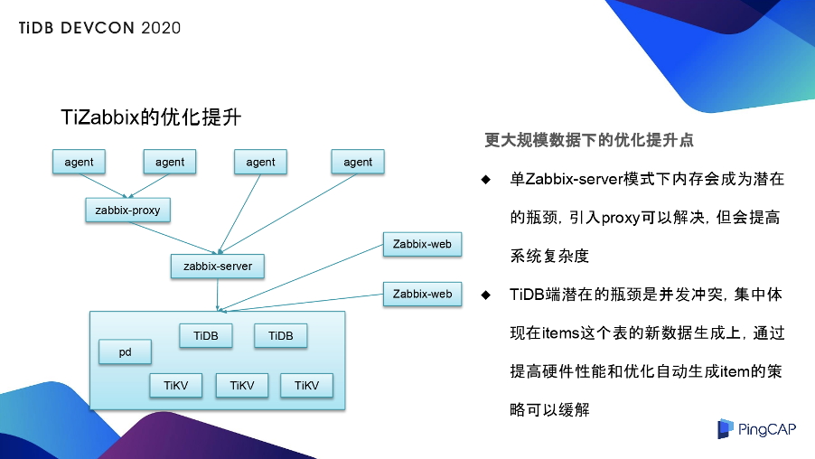 架构图最下面一层是 TiDB,TiDB 目前来看也是存在着一定的潜在的瓶颈,可能主要是并发冲突。因为用到的是比较差的硬件,肯定是要受点限制的,具体表现在并发的性能上会下降一些,不过这个也可以通过逻辑上的方案来规避一下,就是 item(Zabbix 的一个关键数据模型)。在一些极端场景下,自动产生的 item 会比较多,如果它不断的自动生成,相当于会出现写热点,然后会产生并发冲突,进而拖垮整个数据库。所以,在更大规模下,需要优化自动生成的 item 策略。将 item 的自动生成策略打散,不要在同一时间点生成过多的 item,来缓解可能引起的并发冲突。当然,通过提升硬件的性能,也能够来弥补这个问题。