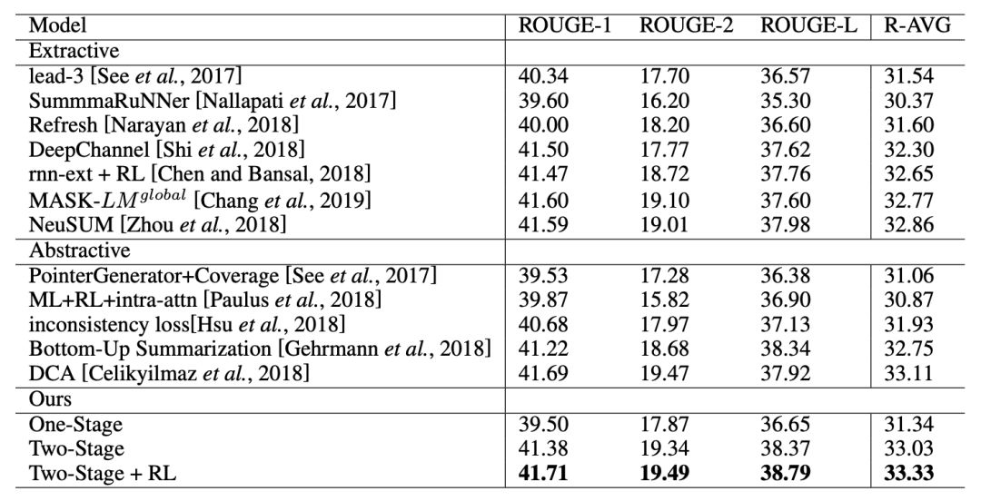 为了验证模型的效果,作者在 CNN/DailyMail 和 NYT-50 两个摘要数据集上进行了实验,并与当前一些主要方法进行了对比。其中 NYT-50 数据集是 NYT 数据集中删选所有摘要长度大于 50 的样本得到。在 CNN/DailyMail 数据集上作者进行了消融实验,以此来验证每个模块的作用。