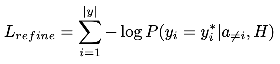 这一阶段解码器端并没有使用 BERT 产生上下文表示。该过程的损失函数定义为: