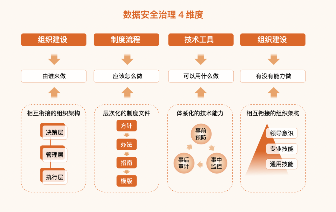 从安全治理的建设围绕的 4 个维度来看,人员能力本身就是治理建设的一个维度,而组织建设、制度流程与技术工具 3 个维度,想要实际落地并发挥出实际效果,归根结底还是需要依靠安全团队人员能力。