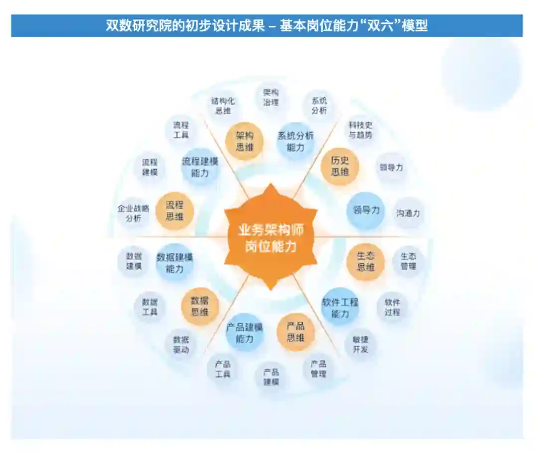 白皮书基于企业架构工程实践,将完整的业务架构师岗位能力划分为六种思维模式和六种执行能力,也即“双六”模型,分别是架构思维与系统分析能力、流程思维与流程建模能力、数据思维与数据建模能力、产品思维与产品建模能力、生态思维与软件工程能力、历史思维与领导力,如下图所示: