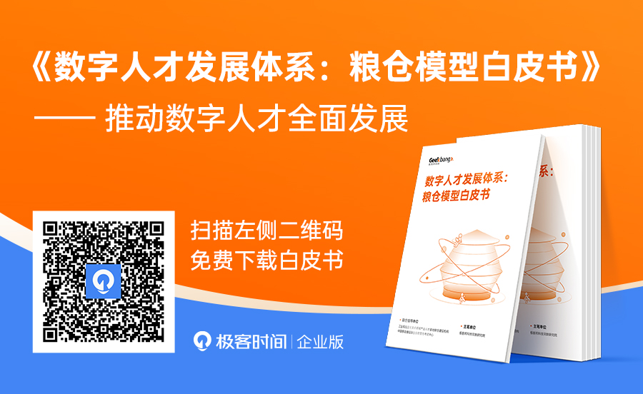 极客邦科技双数研究院联合各行各业的生态伙伴,共同发布《数字人才发展体系:粮仓模型白皮书》,结合数字经济观察以及在数字人才发展与培养方面的研究和发现,将共识的三类数字人才进一步细分为更加匹配企业架构的五层数字人才,以期为企业数字化战略落地构筑更加扎实的人才体系,帮助企业在数字化转型道路上顺利前行。