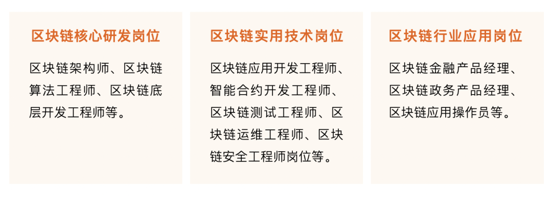区块链行业应用岗位:区块链金融产品经理、区块链政务产品经理、区块链应用操作员等。