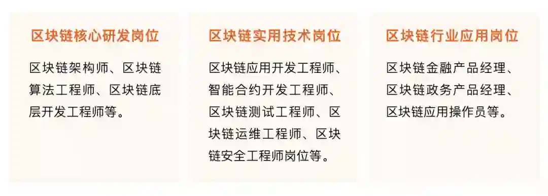 区块链实用技术岗位:区块链应用开发工程师、智能合约开发工程师、区块链测试工程师、区块链运维工程师、区块链安全工程师岗位等。
