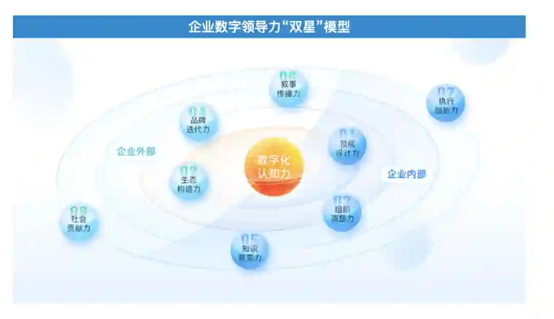 在数字化转型中,企业领导力的核心源自对数字化转型的认知,只有正确而深入的认知才能引来“志同道合”的伙伴。领导力分成企业内部和企业外部两个部分,每个部分包括四个层级,各有一种关键能力,能力之间相互支持,如同运行在同一轨道上的两颗行星,所有行星围绕“数字化认知力”这颗恒星运转。可以说,“数字化认知力”决定了其他能力的最终效果。