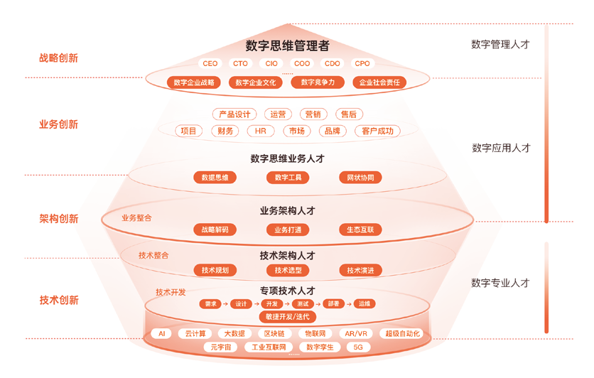 在多数企业中,业务人员在企业总人数中往往占绝大多数,也是企业数字化转型中在人才培养方面,会投入精力最大的部分。这部分人才岗位覆盖广泛,从销售营销到财务人力等等,他们做的还是原来的专业,营销还是营销,HR 还是 HR,但是他们需要提升数字化的思维,就是我们常说的数据思维。同时,还要掌握数字工具的使用技能,要有生态协同的意识,即从思想上和工具能力上都要进行培养,来支撑业务的创新。