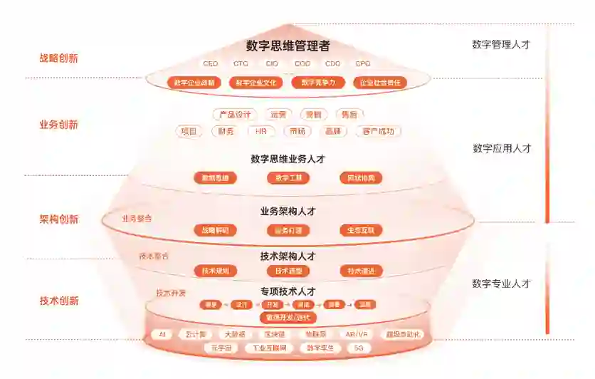 最后,结合上面五层人才的介绍,这个模型也强调四大创新,包括战略创新、业务创新、架构创新和技术创新,这四个创新也是和企业数字化转型的路径相呼应的,也即前文提到的“数字化转型路径四部曲”,即从战略转型到架构转型,再到技术转型,最后到业务转型。