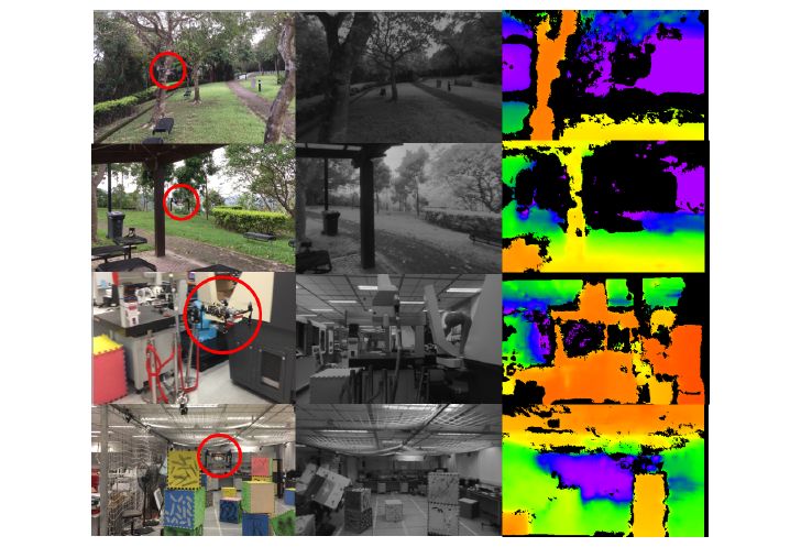 图4:在机载UAV上进行的实验,左为实际飞行环境,红圈内为UAV,中间和右列为相机拍摄图片和深度估计。