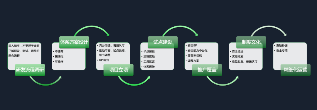 下图详细罗列了从 0 到 1 建设开发安全体系的建议步骤。除了前期整体的建设步骤,关键效果的显现离不开最后的精细化运营,即查缺补漏,重点解决一些痛点,例如越权漏洞的检测。