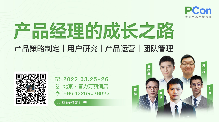 互联网蓝海消失,产品经理的发展方向在哪里?PCon 全球产品创新大会将于 2022 年 3 月 25-26 日 落地北京,来自 Google、小米、字节跳动、芒果 TV、阿里巴巴、Soul、小罐茶、爱奇艺、钉钉等企业的产品专家,齐聚一堂,分享各自在产品创新、产品运营、团队成长等方面的宝贵经验,期待你的参与学习。