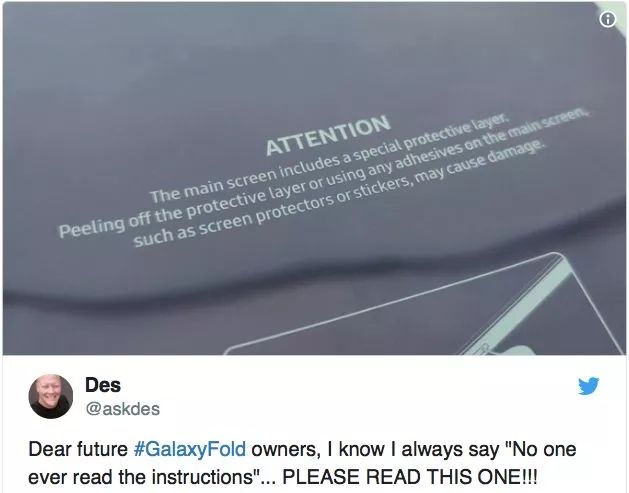 另外,一些评测人员称,他们已经撕除了屏幕上的一层膜,造成了屏幕的损坏。(其实)Galaxy Fold主屏幕上的保护层是显示屏结构的一部分,旨在保护屏幕免受意外刮伤。移除保护层或在主显示器上添加粘合剂可能会造成损坏。我们将确保这些信息清楚地传达给我们的客户。