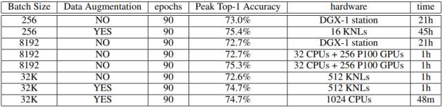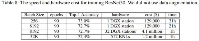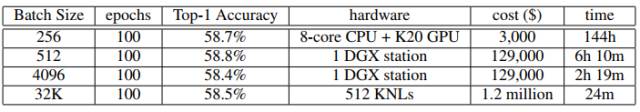 他们将批量大小扩展到32k,使用英特尔KNL,硬件费用120万美元。