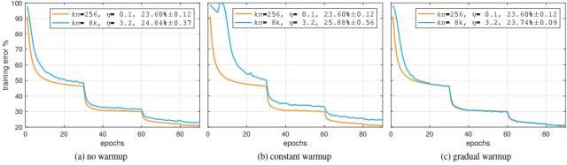 为了克服minibatch过大的问题,Facebook团队使用了一个简单的、可泛化的线性缩放规则调整学习率(learning rate)。为了成功应用这一规则,他们在训练中增加了一个预热阶段(warm-up phase)——随着时间的推移,逐渐提高学习率和批量大小,从而帮助保持较小的批次的准确性。在训练开始时使用较低的学习率,克服了早期的优化困难。重要的是,这种方法不仅符合基线验证误差,还产生与了比较小的minibatch基准线匹配的训练误差曲线。