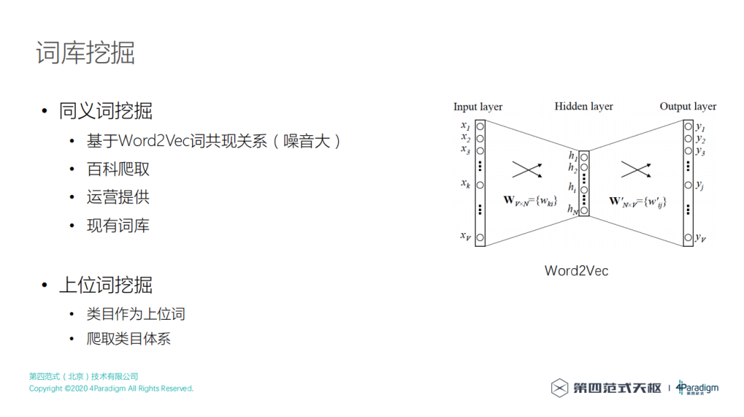 词库如何构建,需要挖掘各种类型的词,比如最常用的同义词和上位词,同义词理解可以用前面举的例子,茭瓜和西葫芦是一回事,获取同义词有很多种方法,使用预训练的词向量方法去找共现关系可以大量的找到同义词 ( 也就是类似word2vec的方法 ),但是找出来之后可能不太准确,需要后期处理一下才能使用。从百度百科上可以爬取到很多同义词,以及业务运营数据库和企业现有词库积累都可以找到同义词,有各种各样的方法去构建同义词库。