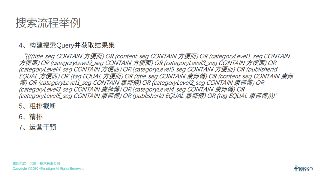 第四步构建一个搜索query,从ES召回结果;第五步拿到ES召回的结果之后,做粗排并截断;第六步做精排;最后做基于业务规则的运营干预,把最终的搜索结果返回给用户,以上就是完整的技术流程。