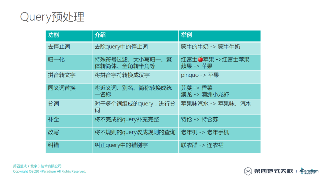当用户在一个电商app上输入搜索词的时候,会先对搜索词进行预处理,这种预处理就包括常见的去停止词、归一化、拼音转文字、同义词替换、分词、补全、改写和纠错等等一系列的处理,然后把用户搜索的不太规范或者不正确的query处理成规范形式和正确形式,并且做一些分词、转换的处理。