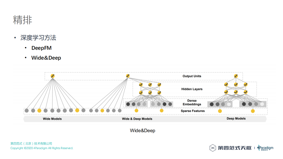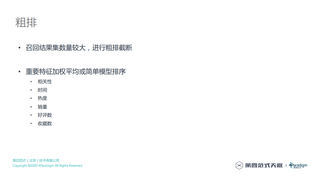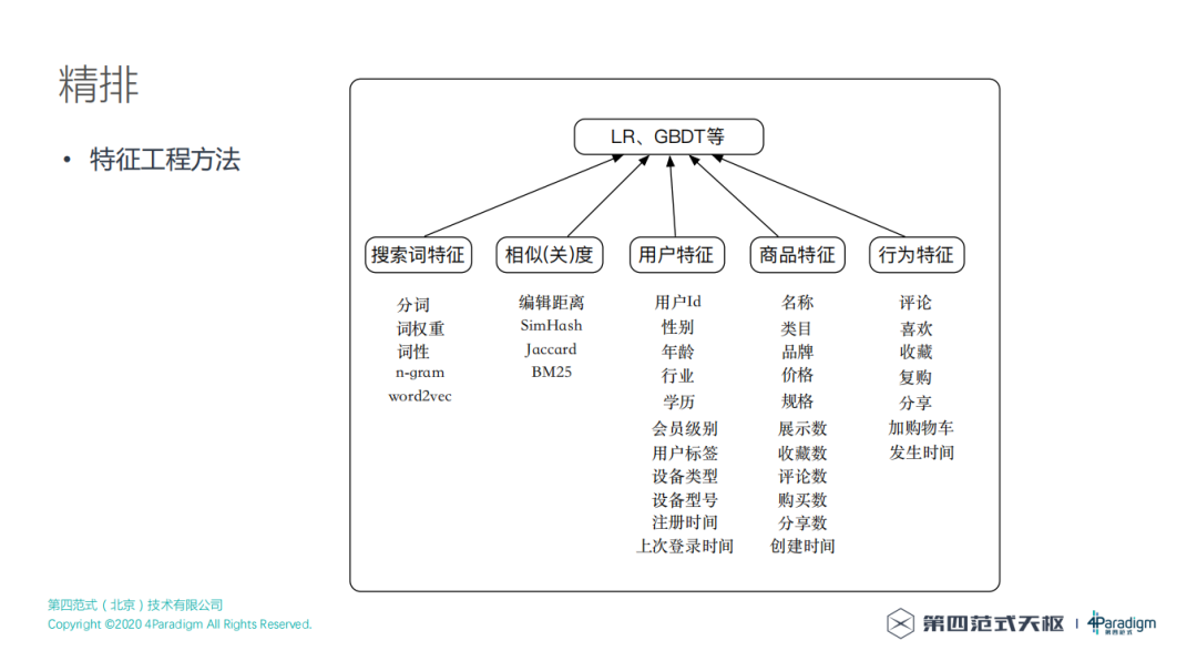 得到粗排结果以后,接下来就是精排,对于搜索来讲,目前来讲主要的优化目标是CTR,用的主要是CTR预估方法,CTR预估有很多不同的方法,比如传统的特征工程方法、深度学习方法等,也可以使用第四范式自研的HyperCycle。