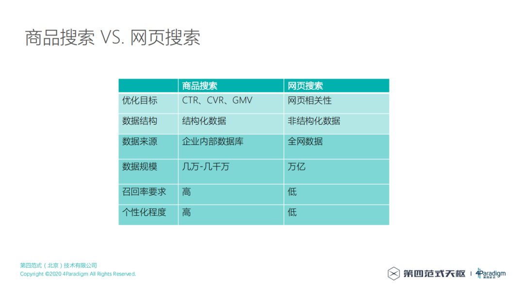 从数据结构方面来讲,网页搜索使用的是全网的非结构化数据,需要额外的非结构化数据处理工作;而对于商品搜索,使用的是优质的结构化数据,比起网页搜索里面参差不齐的非结构化数据,少了数据整理和处理的工作。